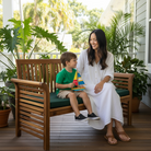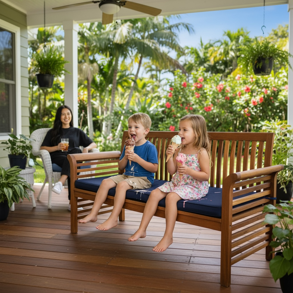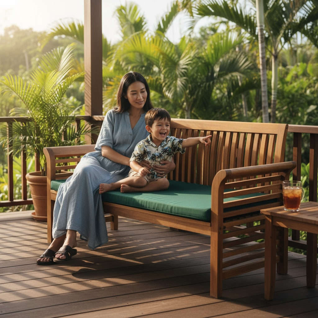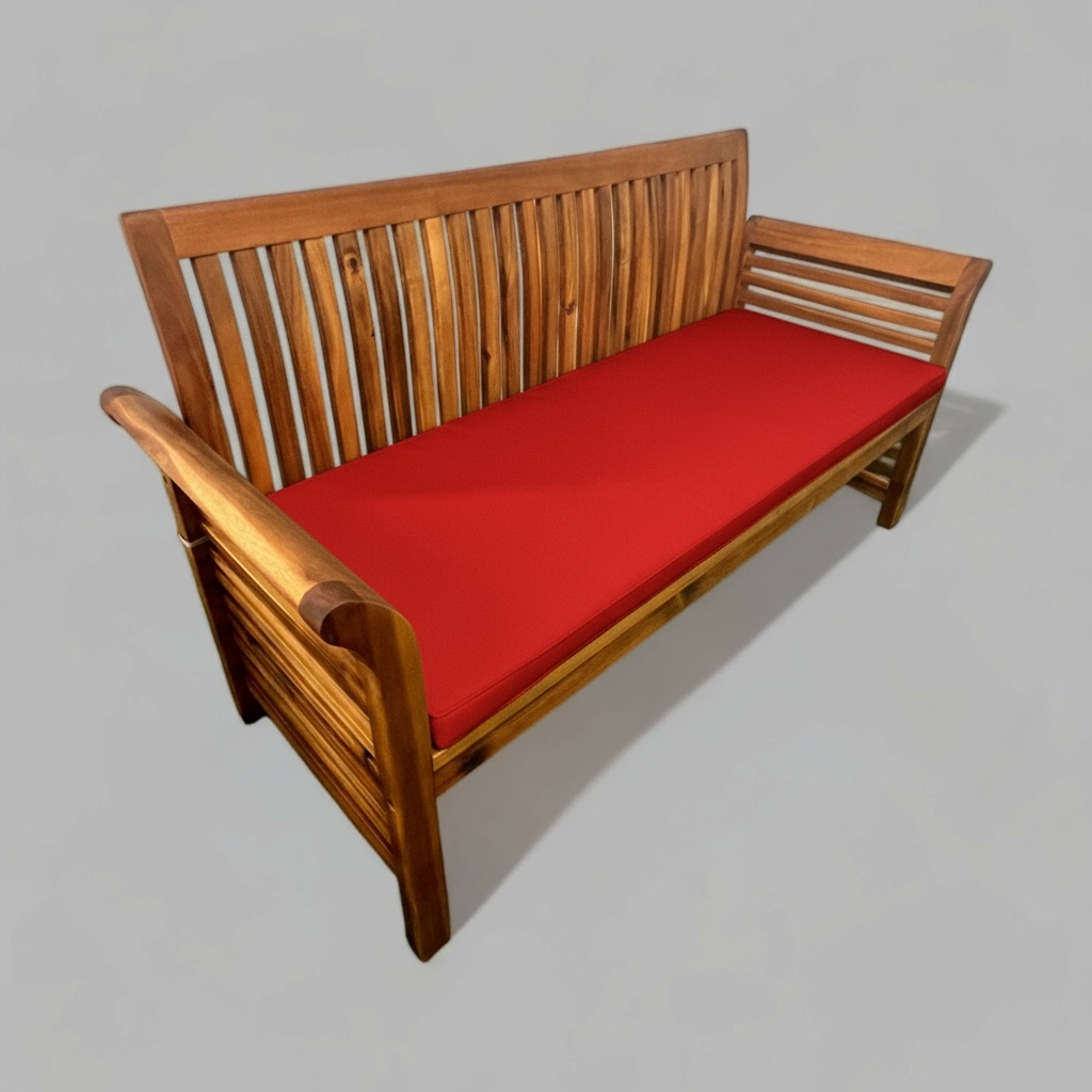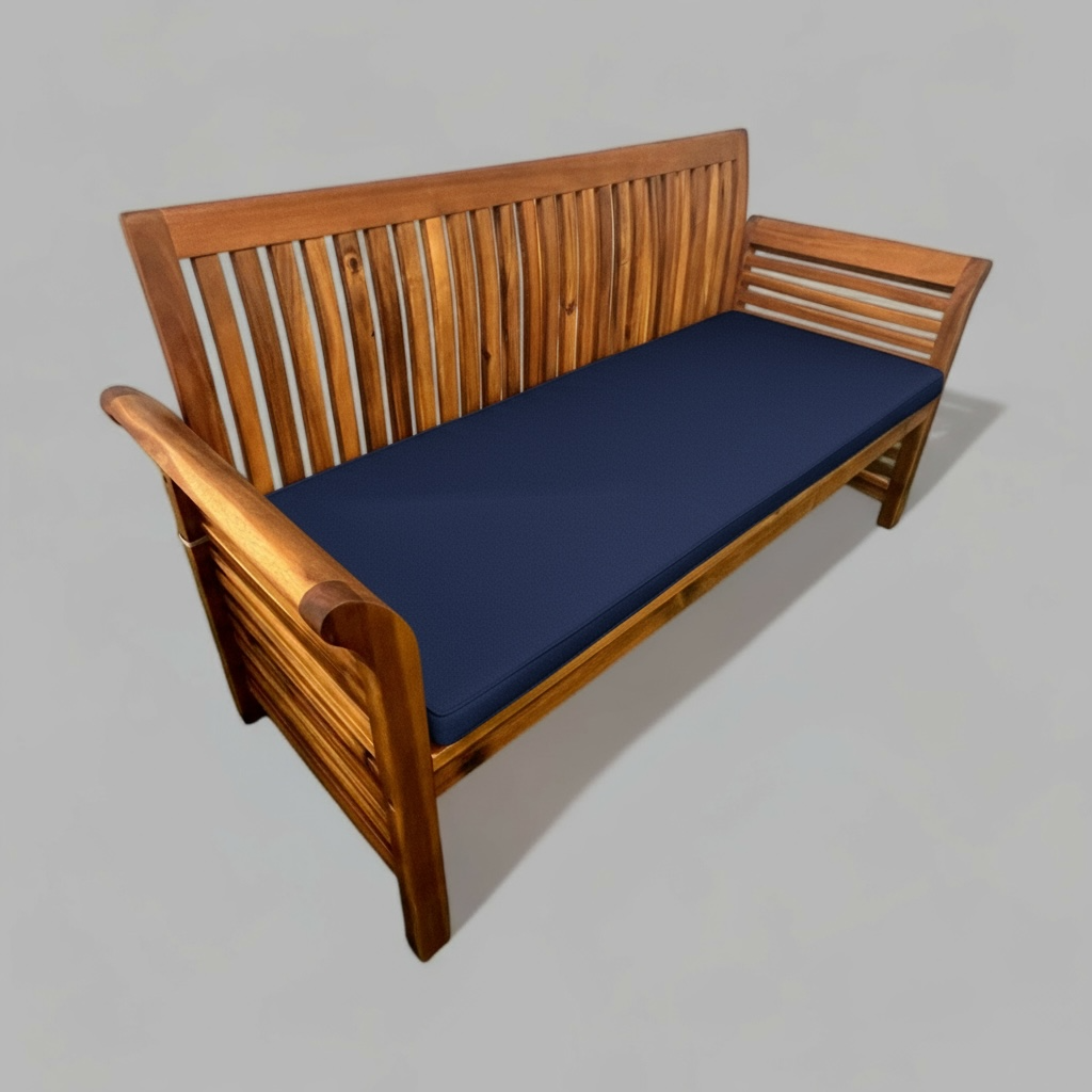 The Riviera Wood Bench comfortably seats two or three people. Or add pillows to create a comfortable reading or napping lounge. Handmade with plantation-grown Acacia wood. Comes with 2" cushion. You can purchase a 3" cushion if you want added cushioning.