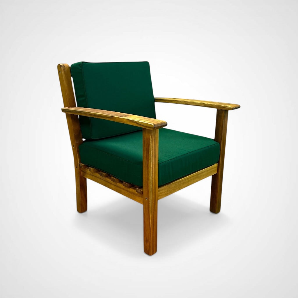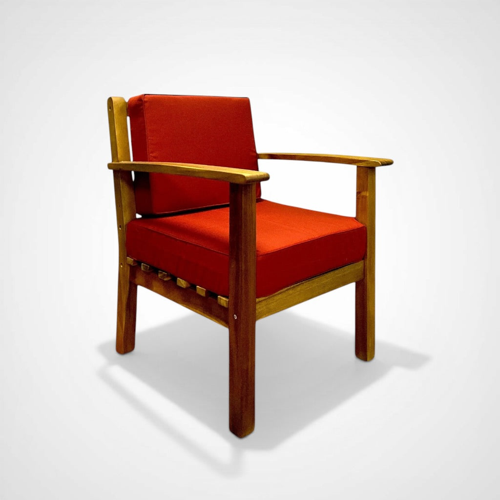 The seat cushion makes this especially comfortable. Works indoors and outdoors. Matches the Hilo Ottoman. Handmade with plantation-grown Acacia wood.