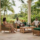 Solid Teak Wood Outdoor Deep Seating Summer Sofa with Olefin Fabric. The Summer Collection is designed with space and practicality in mind. It has a distinctive look but is scaled for smaller patios and outdoor spaces. Summer is our most affordable collection but offers all the same long-lasting qualities and superior construction as all of our premium grade teak product. Choose either a Green or Taupe cover for your cushions. The set includes a Summer Sofa, Summer Coffee Table, and a choice of one or two Summer Club Chairs. You can also add on a Summer Loveset or a side table.