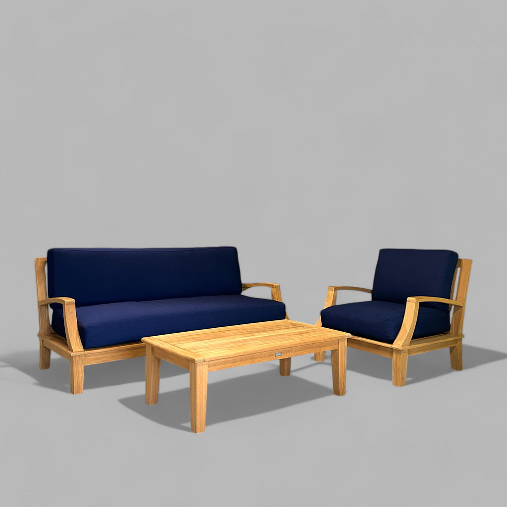 Solid Teak Wood Outdoor Deep Seating Grande Sofa with Olefin Fabric. Our Grande collection is made from generously sized components of premium teak, subtly curved, combining lasting durability with a luxurious feel, a balance of strength and beauty. A great choice for seating areas expecting heavy traffic. Choose either a Blue or Taupe cover for your cushions. The set includes a Grande Sofa, Grande Coffee Table, and a choice of one or two Grande Club Chairs. You can also add on a Dane Side Table. Have a small lanai or small area?