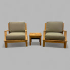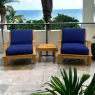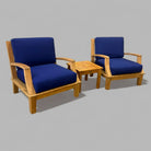 Solid Teak Wood Outdoor Deep Seating Grande Sofa with Olefin Fabric. Our Grande collection is made from generously sized components of premium teak, subtly curved, combining lasting durability with a luxurious feel, a balance of strength and beauty. A great choice for seating areas expecting heavy traffic. Choose either a Blue or Taupe cover for your cushions. The set includes (2) Grande Club Chairs and (1) Dane Side Table.