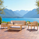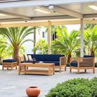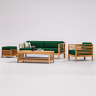 Solid Teak Wood Outdoor Deep Seating Summer Sofa with Olefin Fabric. The Summer Collection is designed with space and practicality in mind. It has a distinctive look but is scaled for smaller patios and outdoor spaces. Summer is our most affordable collection but offers all the same long-lasting qualities and superior construction as all of our premium grade teak product. Choose either a Green or Taupe cover for your cushions. The set includes a Summer Sofa, Summer Coffee Table, and a choice of one or two Summer Club Chairs. You can also add on a Summer Loveset or a side table.