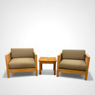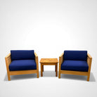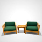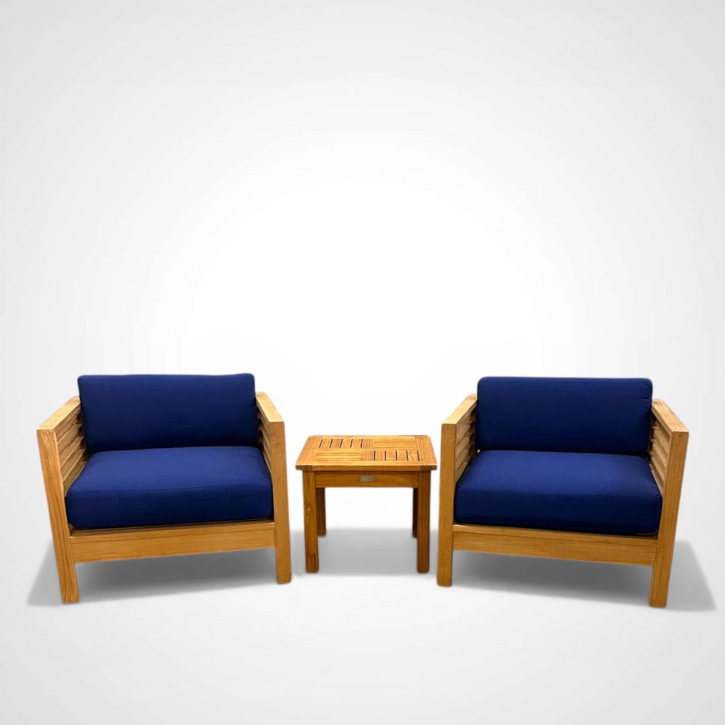 Solid Teak Wood Outdoor Deep Seating Summer Sofa with Olefin Fabric. The Summer Collection is designed with space and practicality in mind. It has a distinctive look but is scaled for smaller patios and outdoor spaces. Summer is our most affordable collection but offers all the same long-lasting qualities and superior construction as all of our premium grade teak product. Choose either a Green or Taupe cover for your cushions. The set includes (2) Summer Club Chairs and (1) Dane Side Table.