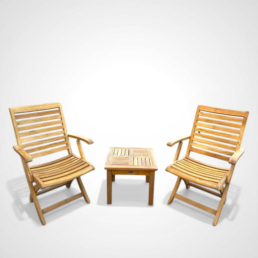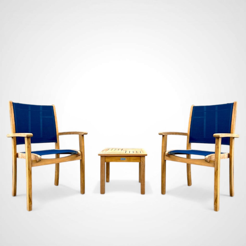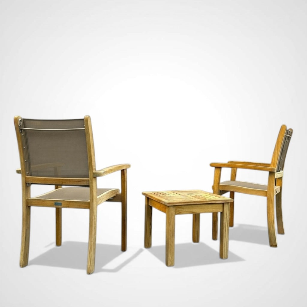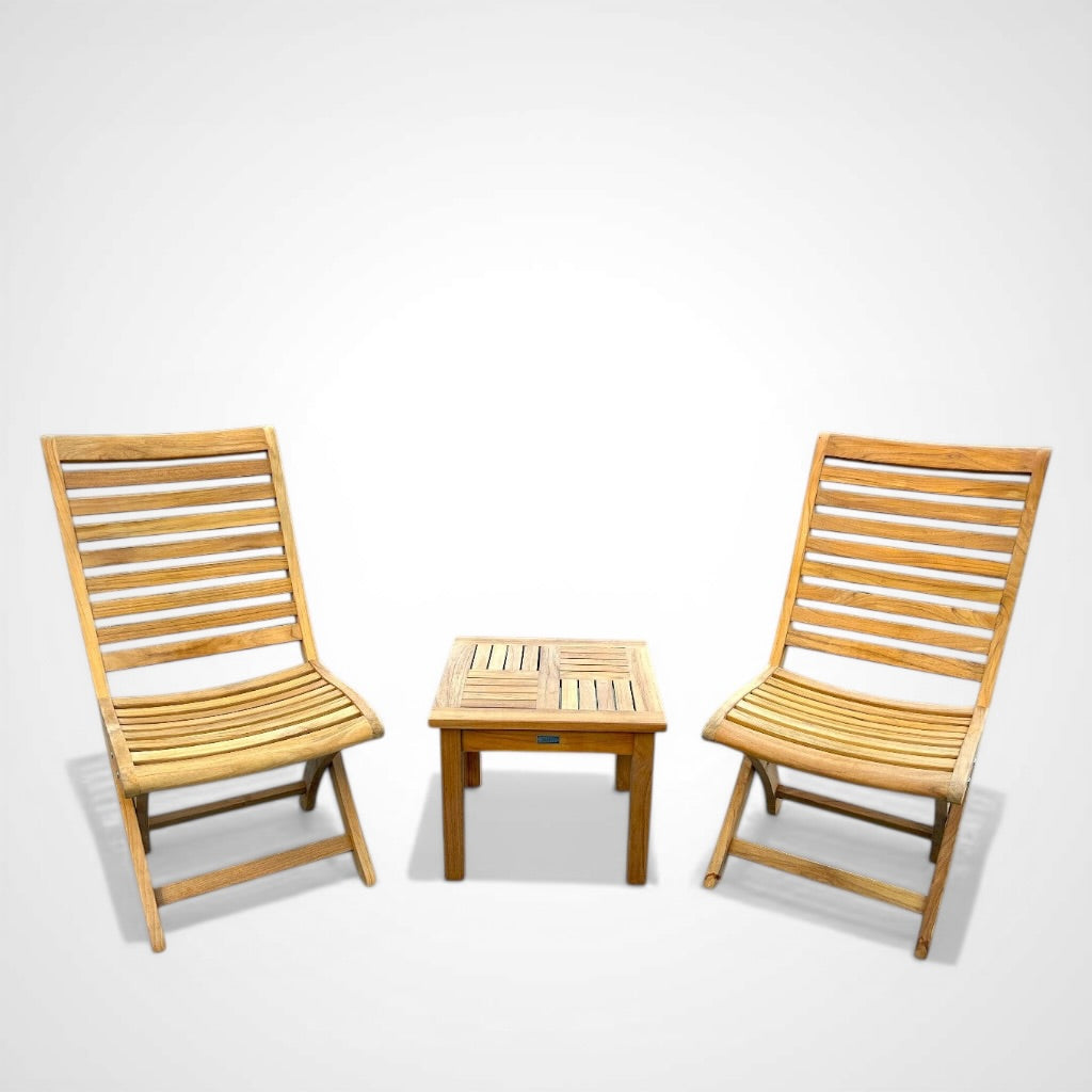 Ahiahi means Evening in Hawaiian. Wind down the day with this beautiful Grade-A teak small area set. The set includes two chairs and a side table. Choose from one of these seating options:
