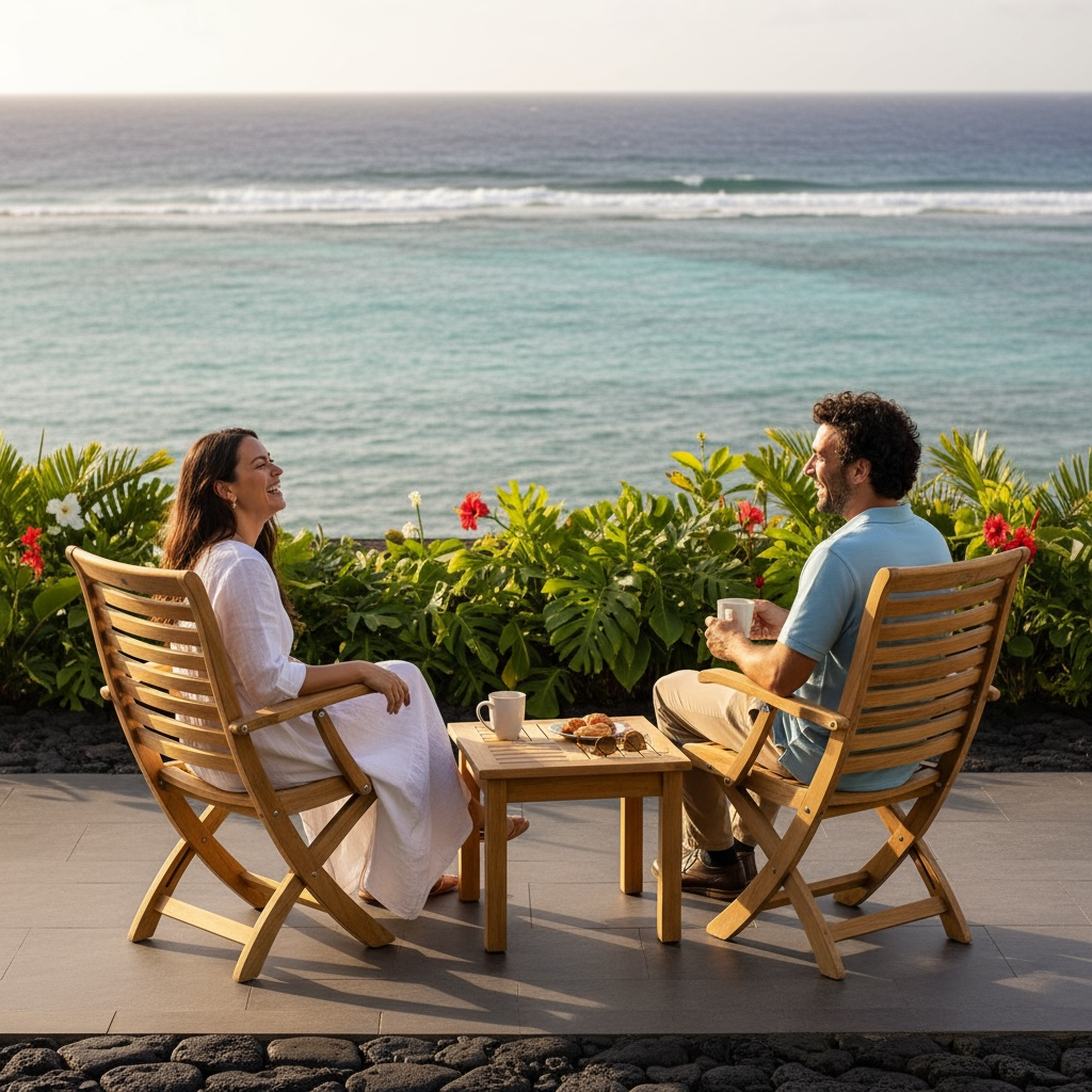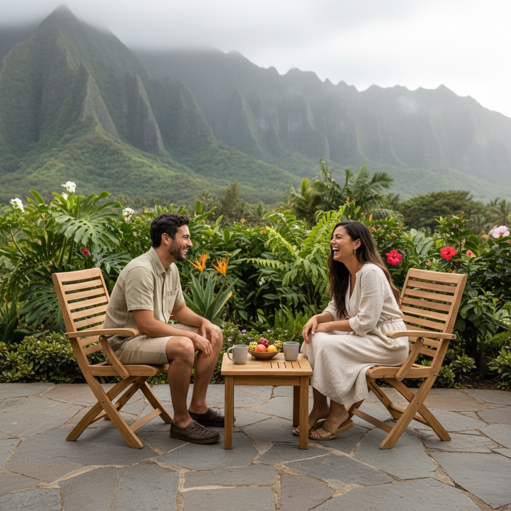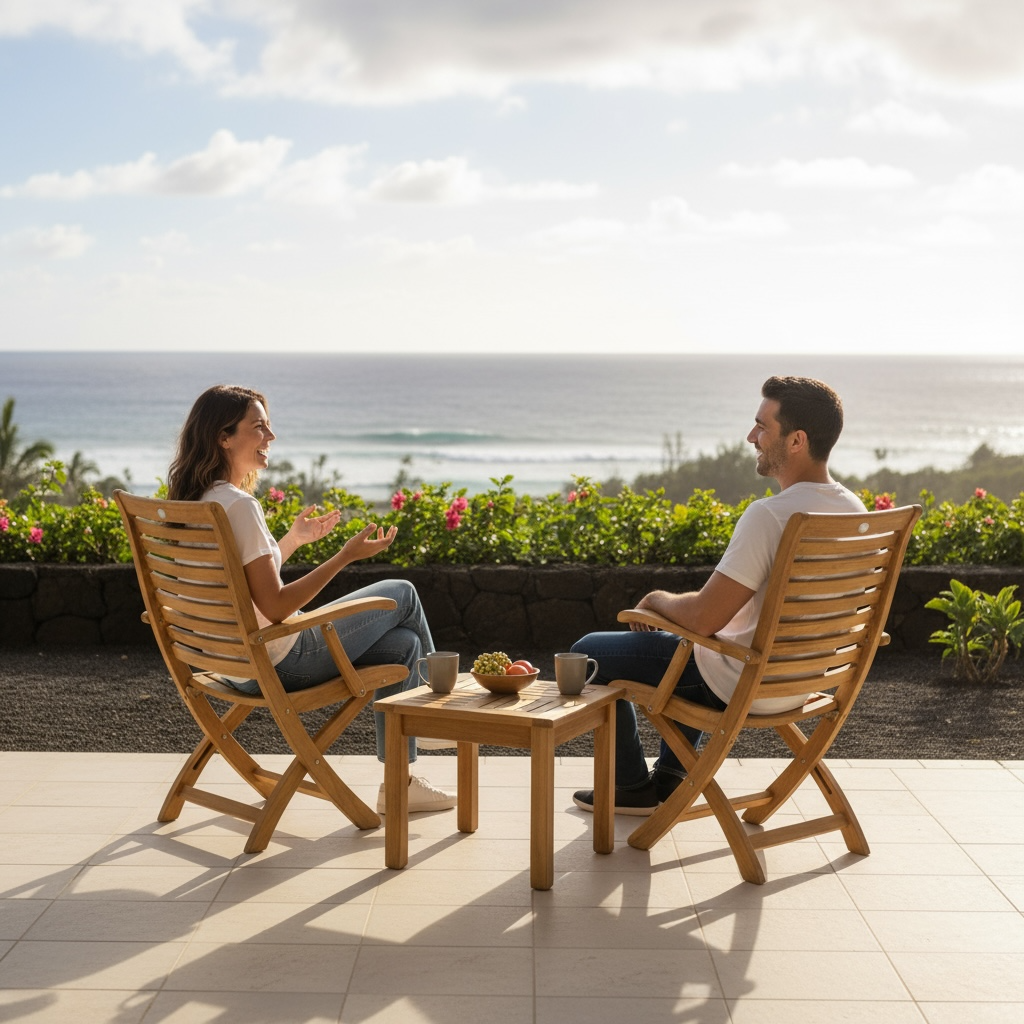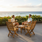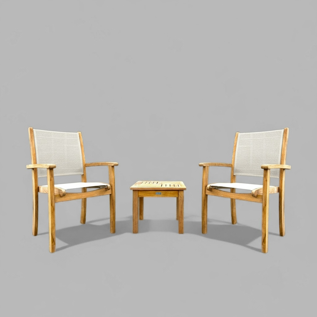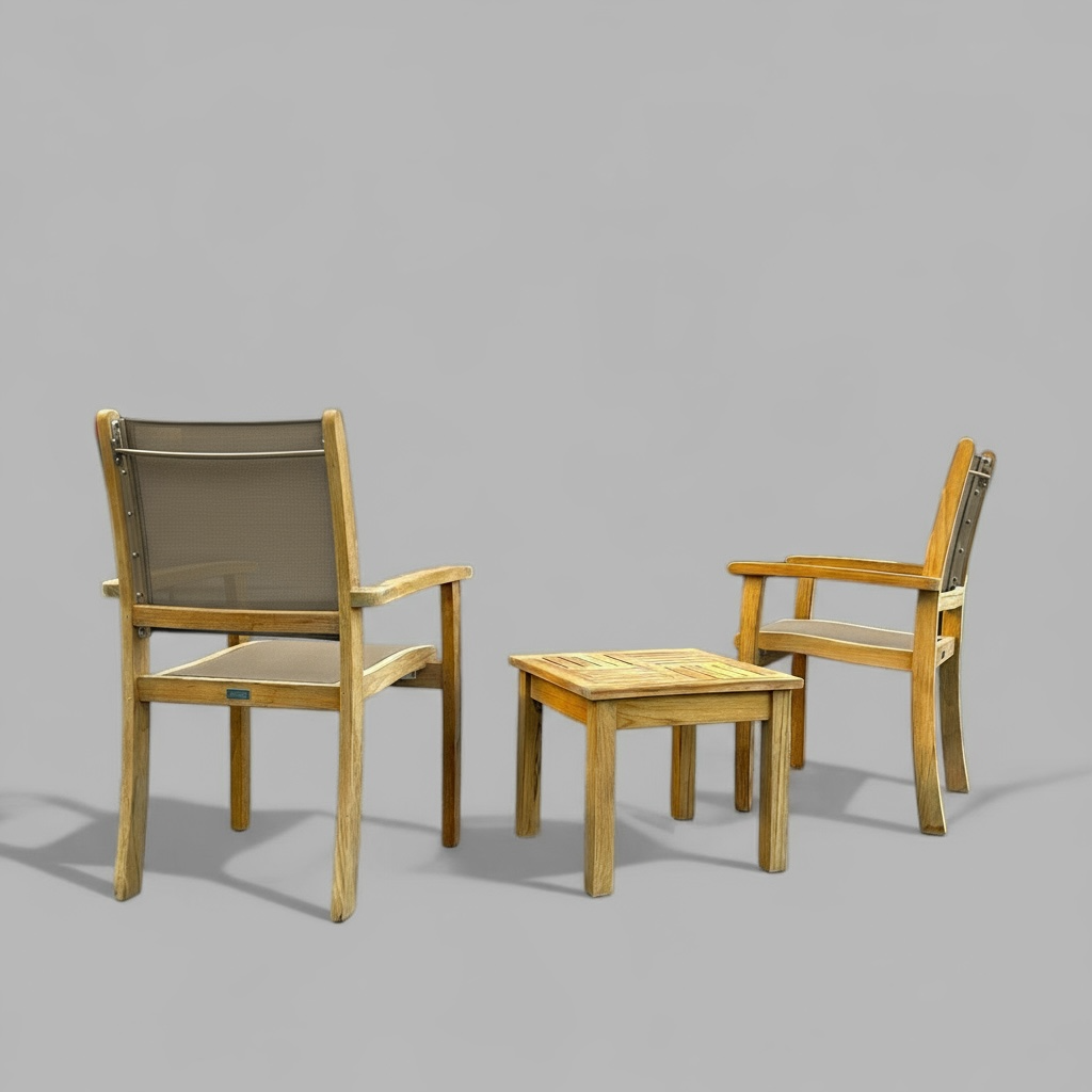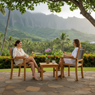 Ahiahi means Evening in Hawaiian. Wind down the day with this beautiful Grade-A teak small area set. The set includes two chairs and a side table. Choose from one of these seating options: