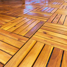 Transform your dull and dumpy floor into an elegant deck creating a great new ambiance with this rustic yet pretty interlocking deck tile. Crafted of acacia wood in a rich and natural oiled finish, this tile strikes a clean-lined square silhouette composed of six or twelve slats. With its mildew, termites, and decay resistance, it is a nice addition to indoor and outdoor settings, such as entryways, mudrooms, balconies, terraces, showers, bathrooms, pools, or anywhere in between. Designed for easier installation, each tile has interlocking sides which you can snap together. Comes with 10 tiles per box (10 sqft).