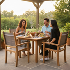 Premium Teak Wood Outdoor Birmingham Square Dining Table with Pearl Arm Chairs. Set includes table and four chairs. The Birmingham square dining table is great for a small group or small space. This chair is a combination of teak wood and sling fabric that provides a unique design as well as comfort. The fabric will not fade in the sun and can be removed and replaced. Choose taupe or blue for your fabric option.