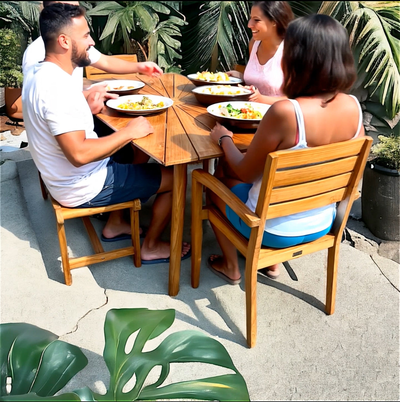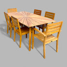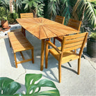 Beautiful Cambria Teak Dining Set includes the Cambria Sun Table and elegant Venice Chairs. Choose from two options ... two armchairs and four side chairs or swap out two side chairs for the elegant Park Bench.