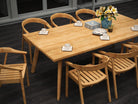 A solid and stylish set, the La Costa Teak Outdoor Dining Set elevates the décor of your outdoor patio spaces with a clean construction. Made of natural sand teak wood, this piece consists of six or eight sturdy chairs and a wide, rectangular table with thick legs. The legs of the chairs angle out and connect to the back and armrest, which are formed from a single piece of wood. Safe in full sun exposure. No assembly is needed. Hawaiian Discovery outdoor furniture is made from ecologically harvested premium teak, cut from the heart of the tree, which makes it immune from deterioration in weather of all kinds. We start with choice cuts, straight, smooth and free of knots – the best quality available. We control drying by preparing the timber in our factory owned kilns. We use time-honored techniques, including dowels and mortise and tenon joinery. All of our teak products are assembled with 304-grade stainless steel hardware. New Teak has a natural honey golden color. Left untreated outdoors, exposed to sunlight and air, the honey color will soften to a light grey and after several years to a silvery patina, which embodies elegant beauty that improves with age. Occasional cleaning with mild soapy water and a soft brush to remove dirt and surface stains or it can be left with no maintenance at all.