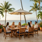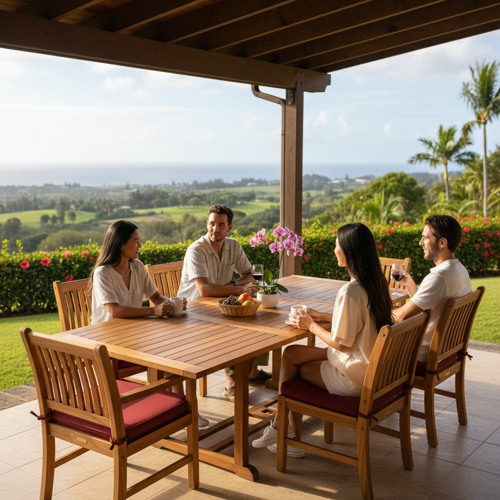- (2) Kahala Side Chairs (Taupe cushion included), (2) Kahala Armchairs (Taupe cushion included), (1) Popoia Bench