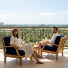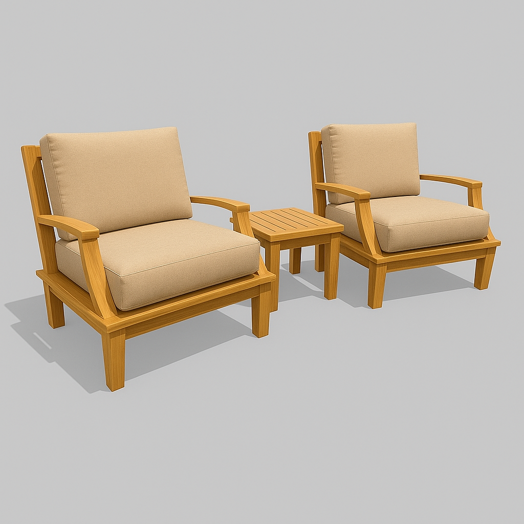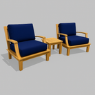 Solid Teak Wood Outdoor Deep Seating Grande Sofa with Olefin Fabric. Our Grande collection is made from generously sized components of premium teak, subtly curved, combining lasting durability with a luxurious feel, a balance of strength and beauty. A great choice for seating areas expecting heavy traffic. Choose either a Blue or Taupe cover for your cushions. The set includes (2) Grande Club Chairs and (1) Dane Side Table.