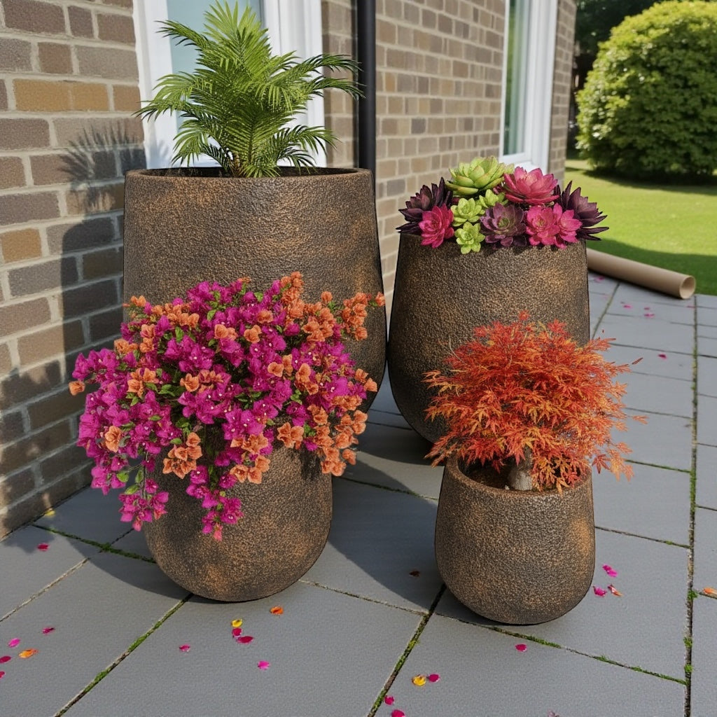 These uniquely designed planters are produced by innovatively mixing cement and recycled styrofoam aggregate. Not only is this a environmentally friendly product, but also lite-weight. The finished product will have the appearance of lava rock.