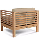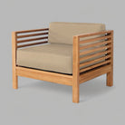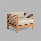 The Summer Teak Outdoor Club Chair with Olefin Cushion is designed with space and practicality in mind. It has a distinctive contemporary look but is scaled for larger patios and outdoor spaces. Combined lasting durability creates a great seating choice for families who love to be outdoors. The luxurious feel with a balance of strength and beauty creates furniture that will last for generations. Safe in full sun exposure. Minor assembly is needed. Our outdoor furniture is made from ecologically harvested premium teak, cut from the heart of the tree, which makes it immune from deterioration in weather of all kinds. We start with choice cuts, straight, smooth and free of knots – the best quality available. We control drying by preparing the timber in our factory owned kilns. We use time-honored techniques, including dowels and mortise and tenon joinery. All of our teak products are assembled with 304-grade stainless steel hardware. New Teak has a natural honey golden color. Left untreated outdoors, exposed to sunlight and air, the honey color will soften to a light grey and after several years to a silvery patina, which embodies elegant beauty that improves with age. Occasional cleaning with mild soapy water and a soft brush to remove dirt and surface stains or it can be left with no maintenance at all.
