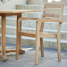 The Venice Teak Outdoor Arm Chair is designed with space and practicality in mind. It has a distinctive contemporary look but is scaled for smaller patios and outdoor spaces. Combined lasting durability creates a great seating choice for families who love to be outdoors. The luxurious feel with a balance of strength and beauty creates furniture that will last for generations. Safe in full sun exposure. No assembly is needed. Hawaiian Discovery outdoor furniture is made from ecologically harvested premium teak, cut from the heart of the tree, which makes it immune from deterioration in weather of all kinds. We start with choice cuts, straight, smooth and free of knots – the best quality available. We control drying by preparing the timber in our factory owned kilns. We use time-honored techniques, including dowels and mortise and tenon joinery. All of our teak products are assembled with 304-grade stainless steel hardware. New Teak has a natural honey golden color. Left untreated outdoors, exposed to sunlight and air, the honey color will soften to a light grey and after several years to a silvery patina, which embodies elegant beauty that improves with age. Occasional cleaning with mild soapy water and a soft brush to remove dirt and surface stains or it can be left with no maintenance at all.