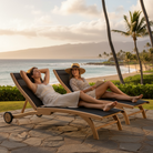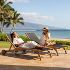 The Pearl Teak Sunlounger is the perfect choice for hot summer days on the deck or by the pool. The gracefully shaped frame made of premium teak is combined with Dura-sling seat and back to provide comfort for hours. Rear wheels allow for easy position adjustment, and the five-position adjustable reclining back makes this the most comfortable lounger to relax on. The luxurious feel with a balance of strength and beauty creates furniture that will last for generations. Safe in full sun exposure. Hawaiian Discovery outdoor furniture is made from ecologically harvested premium teak, cut from the heart of the tree, which makes it immune from deterioration in weather of all kinds. We start with choice cuts, straight, smooth and free of knots – the best quality available. We control drying by preparing the timber in our factory owned kilns. We use time-honored techniques, including dowels and mortise and tenon joinery. All of our teak products are assembled with 304-grade stainless steel hardware. New Teak has a natural honey golden color. Left untreated outdoors, exposed to sunlight and air, the honey color will soften to a light grey and after several years to a silvery patina, which embodies elegant beauty that improves with age. Occasional cleaning with mild soapy water and a soft brush to remove dirt and surface stains or it can be left with no maintenance at all.