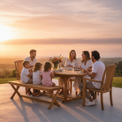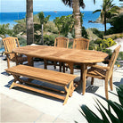 Bring the best out of your patio space with the January Extendable Outdoor Dining Table and Pacifica Arm Chairs. Clean and modern pieces composed entirely of natural teak wood. From the rounded top to the graceful accents on the legs, every inch of these pieces speak to a sense of gentle, subtle beauty. Two optional panels fold out in the center, allowing ten people to gather at once. With an umbrella hole at the center, this table can be enjoyed year-round, rain or shine. The set includes a January Oval Extension Table, (4) Pacifica Side chairs, and (2) Pacifica Armchairs, and an optional bench.