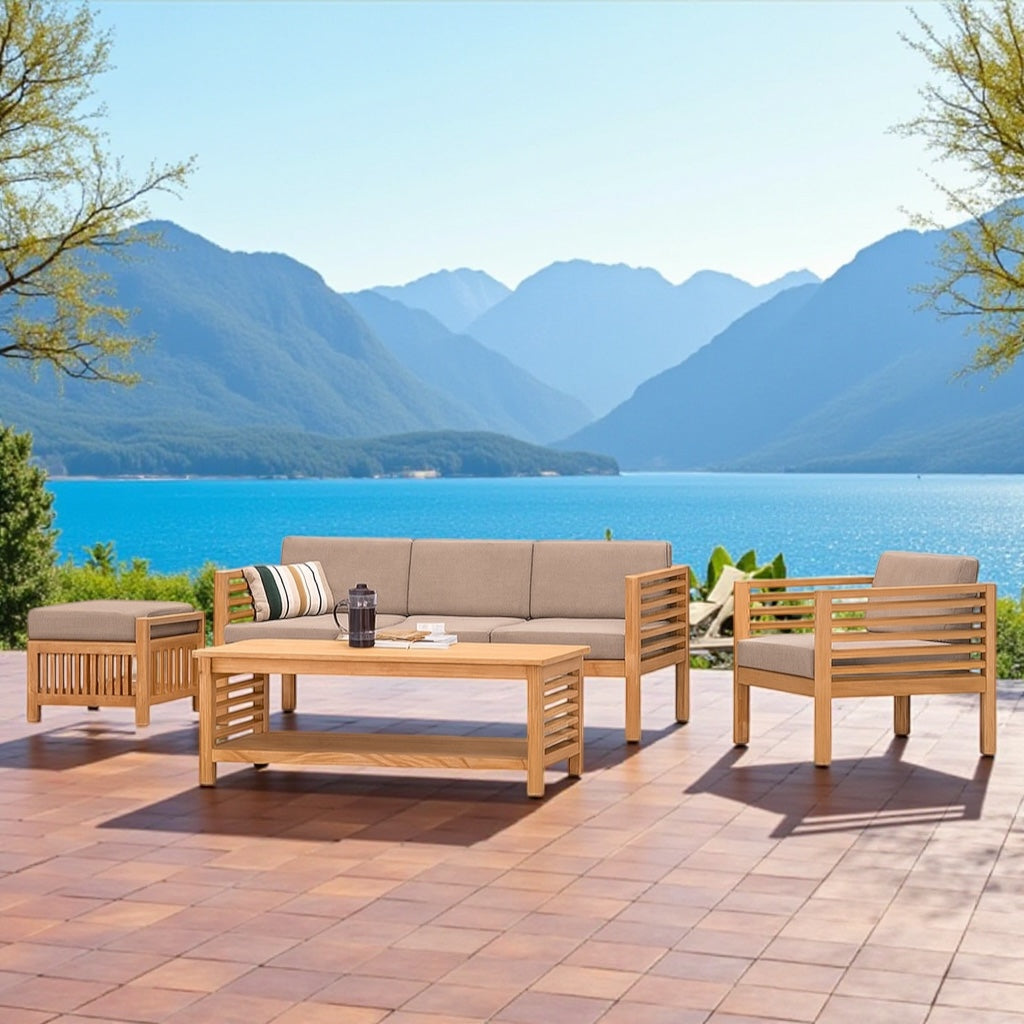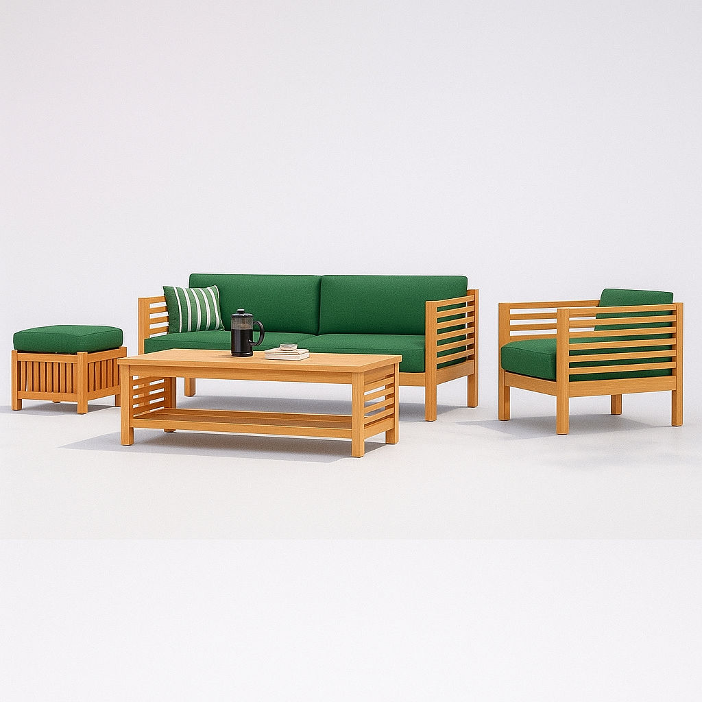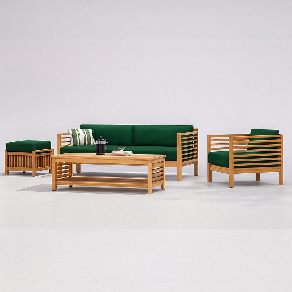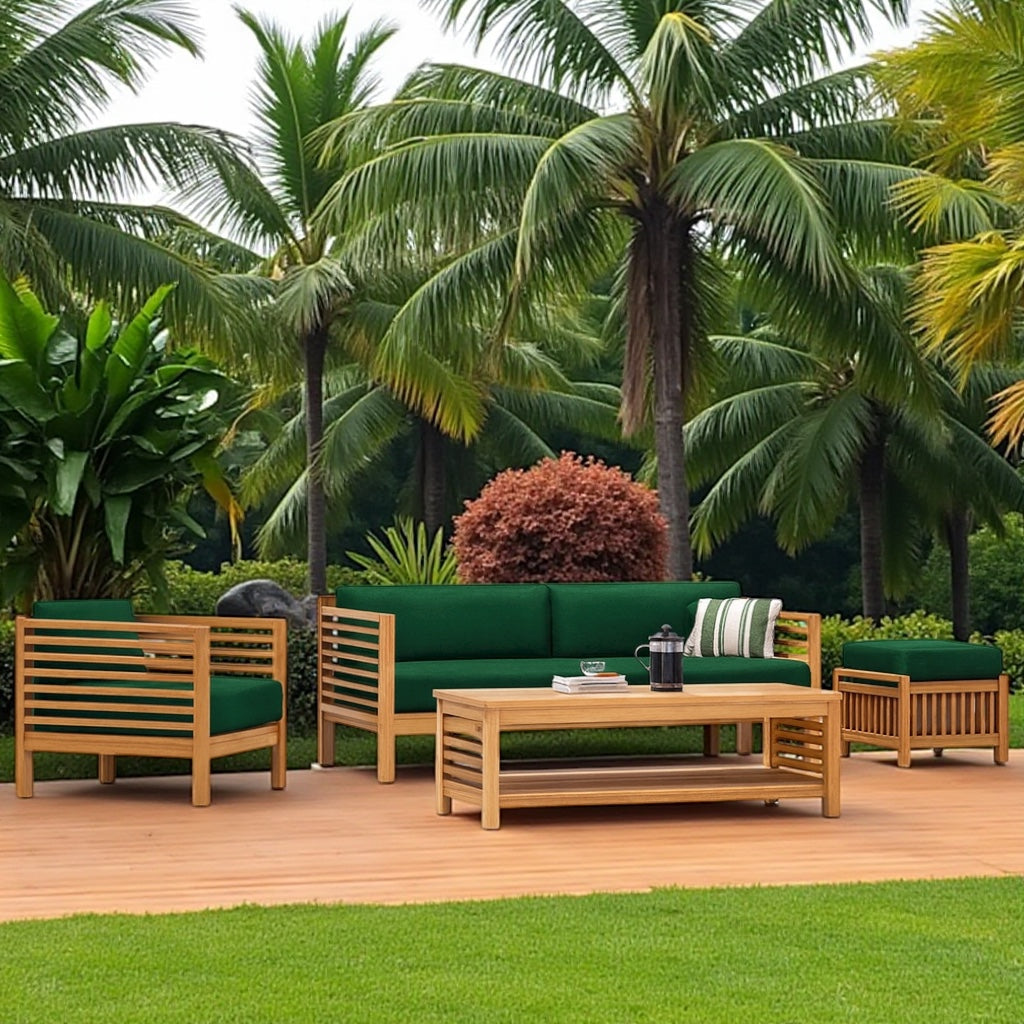 Solid Teak Wood Outdoor Deep Seating Summer Sofa with Olefin Fabric. The Summer Collection is designed with space and practicality in mind. It has a distinctive look but is scaled for smaller patios and outdoor spaces. Summer is our most affordable collection but offers all the same long-lasting qualities and superior construction as all of our premium grade teak product. Choose either a Green or Taupe cover for your cushions.  The set includes a Summer Sofa, Summer Coffee Table, and a choice of one or two Summer Club Chairs.  You can also add on a Summer Loveset or a side table.