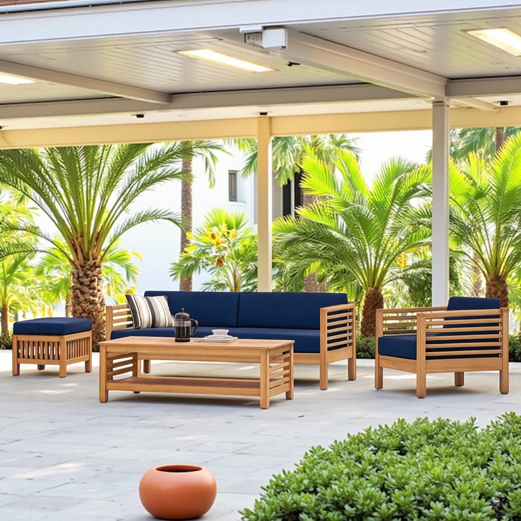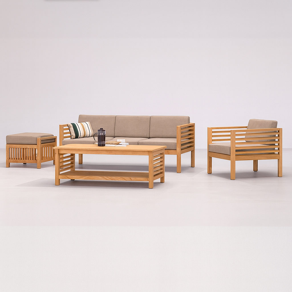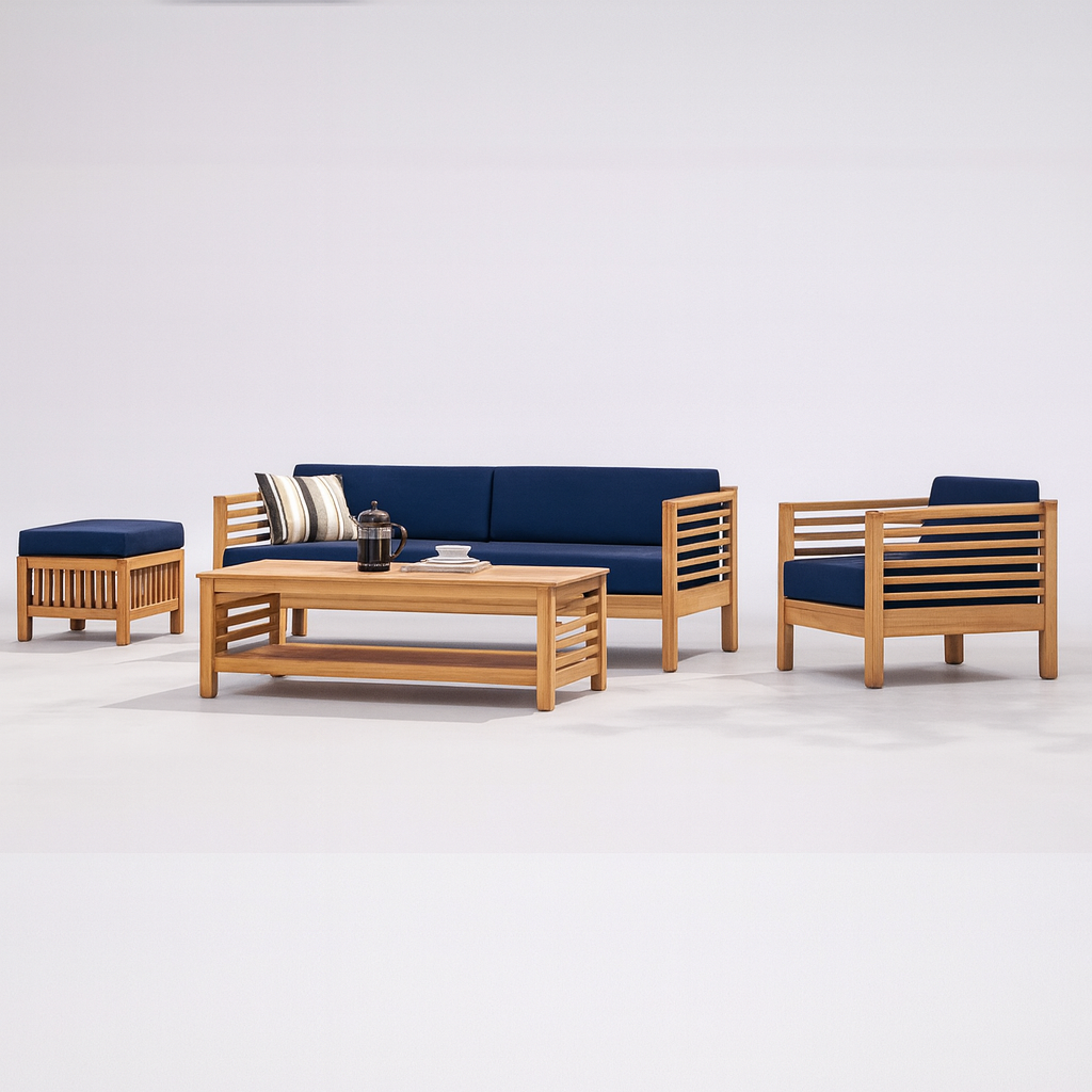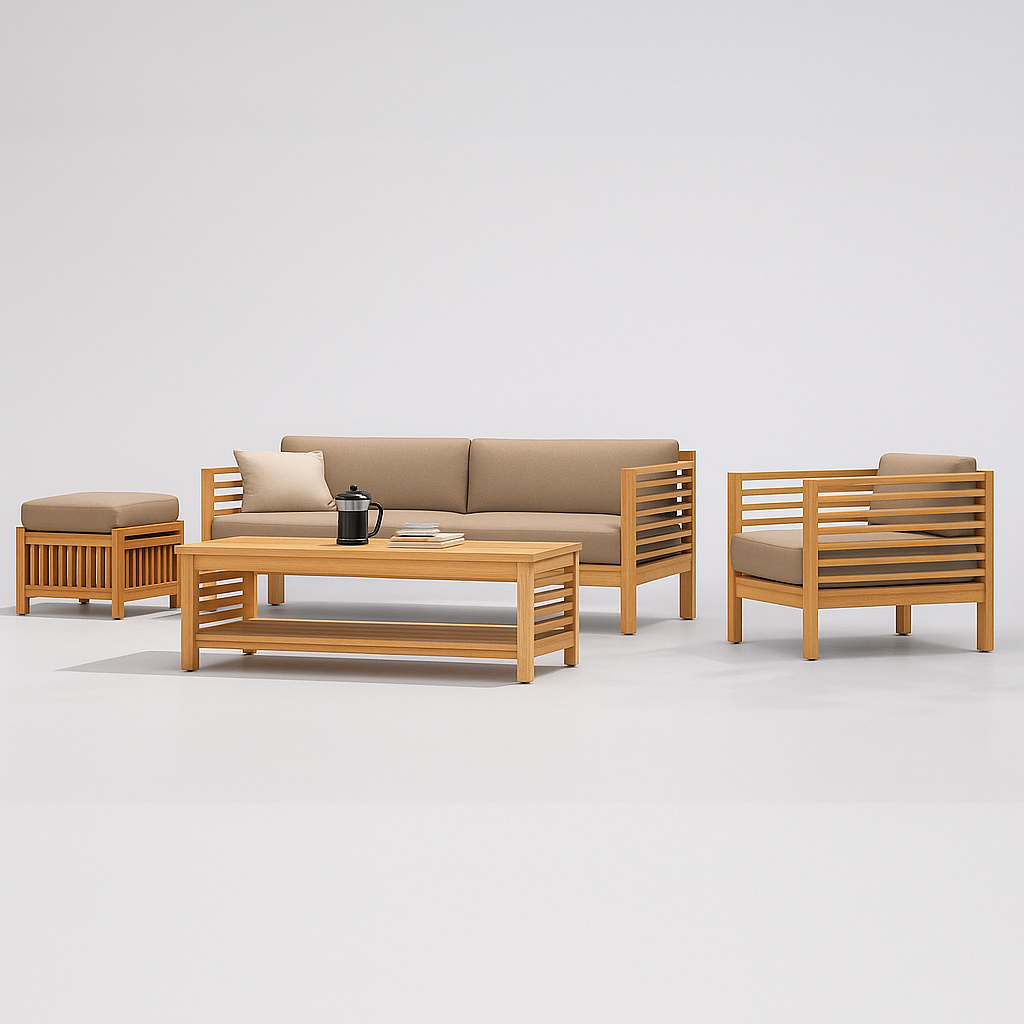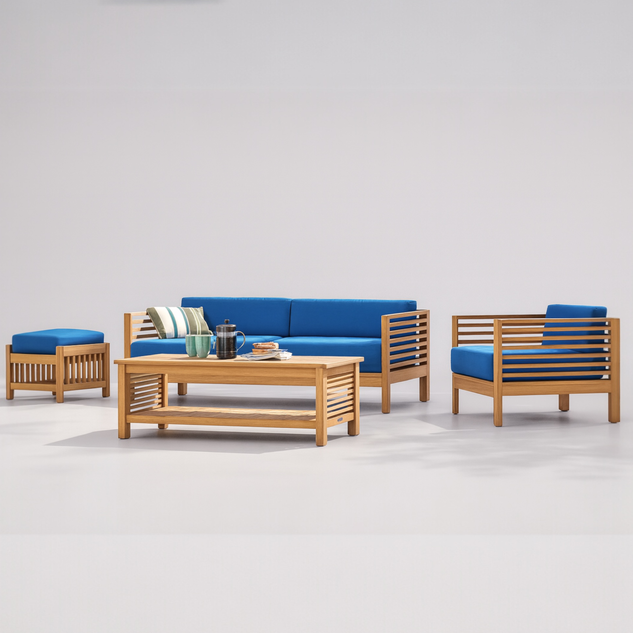 Solid Teak Wood Outdoor Deep Seating Summer Sofa with Olefin Fabric. The Summer Collection is designed with space and practicality in mind. It has a distinctive look but is scaled for smaller patios and outdoor spaces. Summer is our most affordable collection but offers all the same long-lasting qualities and superior construction as all of our premium grade teak product. Choose either a Green or Taupe cover for your cushions.  The set includes a Summer Sofa, Summer Coffee Table, and a choice of one or two Summer Club Chairs.  You can also add on a Summer Loveset or a side table.