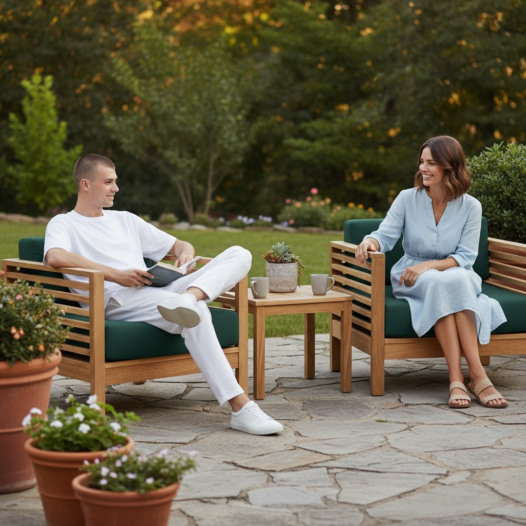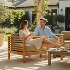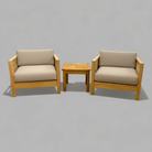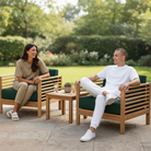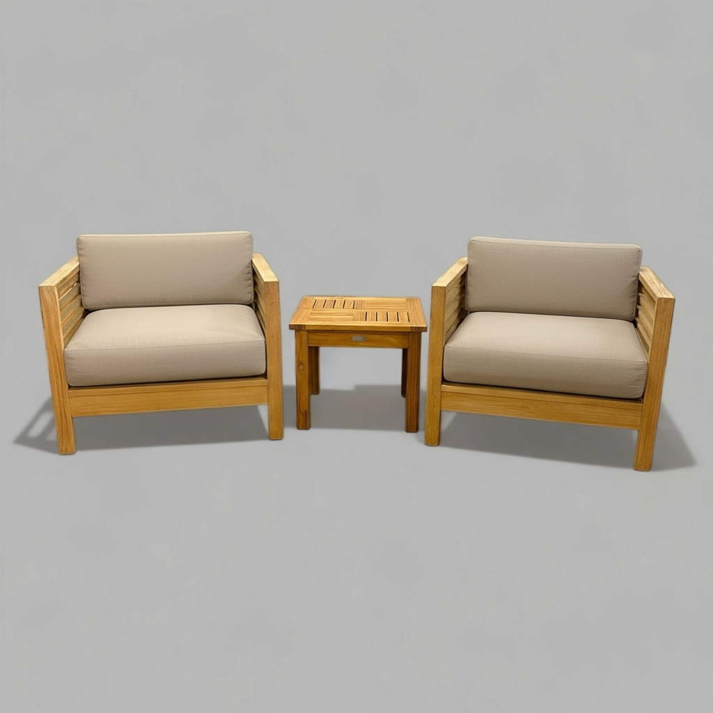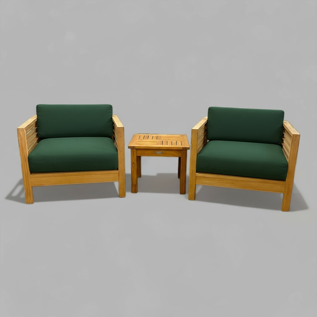 Solid Teak Wood Outdoor Deep Seating Summer Sofa with Olefin Fabric. The Summer Collection is designed with space and practicality in mind. It has a distinctive look but is scaled for smaller patios and outdoor spaces. Summer is our most affordable collection but offers all the same long-lasting qualities and superior construction as all of our premium grade teak product. Choose either a Green or Taupe cover for your cushions. The set includes (2) Summer Club Chairs and (1) Dane Side Table.