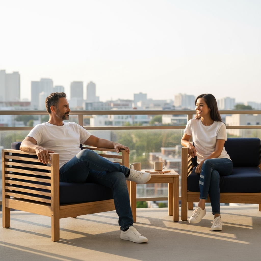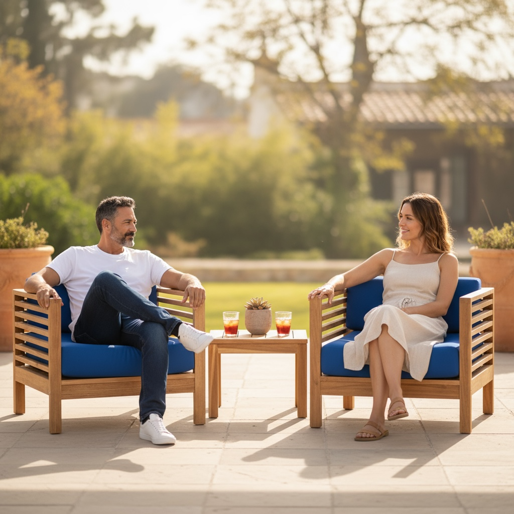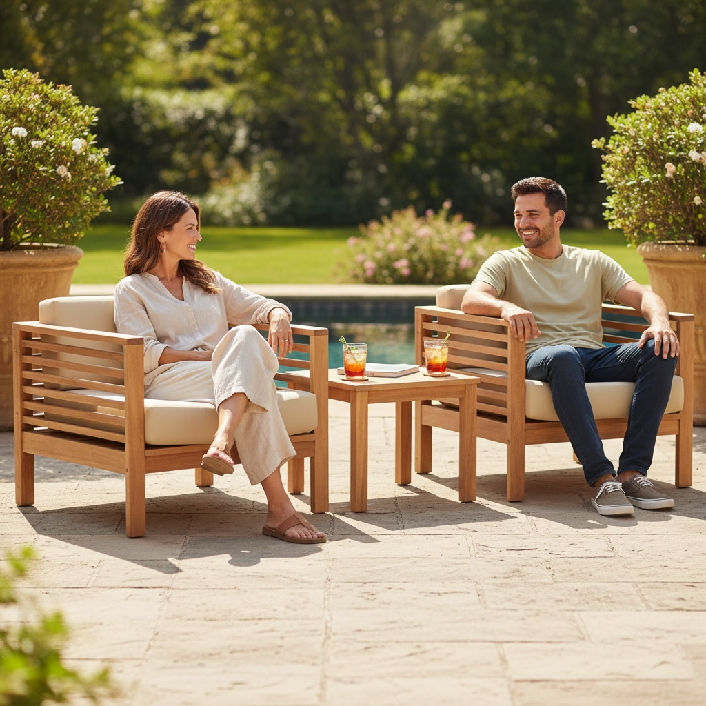 Solid Teak Wood Outdoor Deep Seating Summer Sofa with Olefin Fabric. The Summer Collection is designed with space and practicality in mind. It has a distinctive look but is scaled for smaller patios and outdoor spaces. Summer is our most affordable collection but offers all the same long-lasting qualities and superior construction as all of our premium grade teak product. Choose either a Green or Taupe cover for your cushions. The set includes (2) Summer Club Chairs and (1) Dane Side Table.