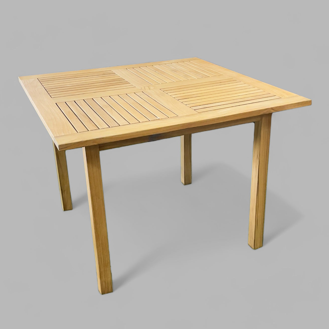 The Birmingham Square Teak Outdoor Dining Table is designed and hand-crafted from naturally aged teak wood. Featuring a natural sand finish, this sleek and stylish design finds easy placement in a variety of outdoor décor themes. Safe in full sun exposure. Arrives flat packed and requires simple assembly. Providing an exceptional outdoor dining experience for decades with minimal time-consuming upkeep, leaving more time to enjoy family and friends. A contemporary look from a classic style from the patio, poolside or on a smaller balcony. The luxurious feel with a balance of strength and beauty creates furniture that will last for generations. Our outdoor furniture is made from ecologically harvested premium teak, cut from the heart of the tree, which makes it immune from deterioration in weather of all kinds. We start with choice cuts, straight, smooth and free of knots – the best quality available. We control drying by preparing the timber in our factory owned kilns. Safe in full sun exposure and we use time-honored techniques, including dowels and mortise and tenon joinery. New Teak has a natural honey golden color. Left untreated outdoors, exposed to sunlight and air, the honey color will soften to a light grey and after several years to a silvery patina, which embodies elegant beauty that improves with age. Occasional cleaning with mild soapy water and a soft brush to remove dirt and surface stains or it can be left with no maintenance at all.