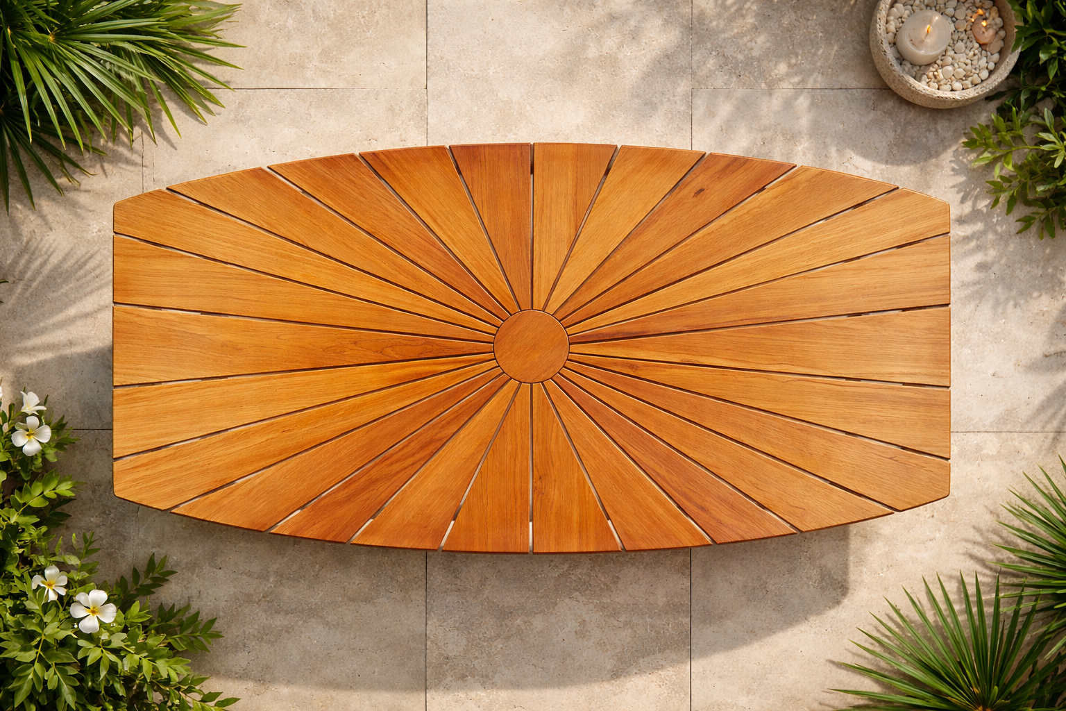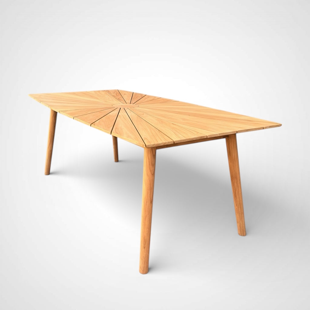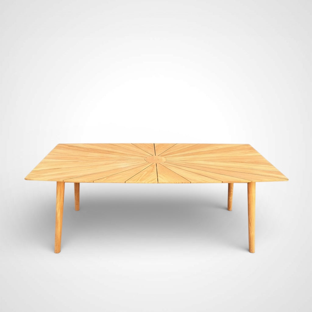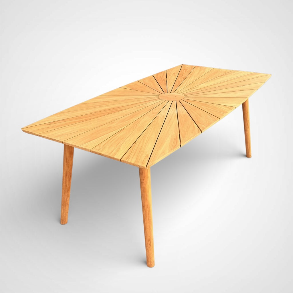 Solid Teak Wood Outdoor Cambria Dining Table. Cambria boats-shaped table is a great dining option for your outdoor dining. Table top planks are laid in a sunburst pattern. This table seats six comfortably and makes an excellent choice for a modern patio or poolside setting. Providing an exceptional outdoor experience for decades with minimal time-consuming upkeep, leaving more time to enjoy family and friends. A contemporary look from a classic style from the patio, poolside or on a medium balcony.