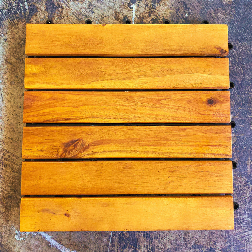 Transform your dull and dumpy floor into an elegant deck creating a great new ambiance with this rustic yet pretty interlocking deck tile. Crafted of acacia wood in a rich and natural oiled finish, this tile strikes a clean-lined square silhouette composed of six or twelve slats. With its mildew, termites, and decay resistance, it is a nice addition to indoor and outdoor settings, such as entryways, mudrooms, balconies, terraces, showers, bathrooms, pools, or anywhere in between. Designed for easier installation, each tile has interlocking sides which you can snap together. Comes with 10 tiles per box (10 sqft).
